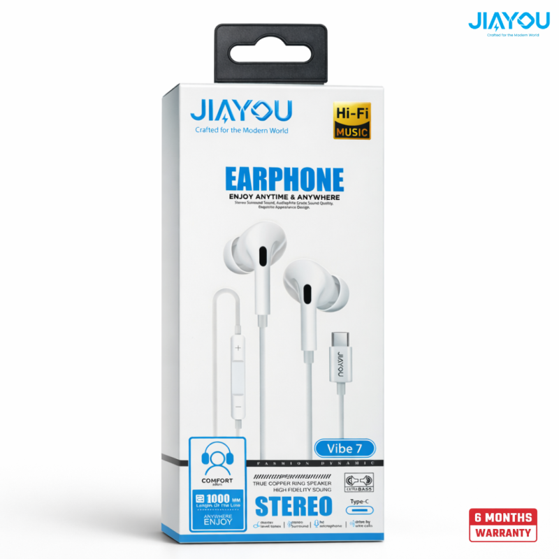 The Jiayou Vibe 7 is a Type-C wired earphone designed for clear stereo sound and everyday listening. Built for modern smartphones without a 3.5mm headphone jack, it connects directly via Type-C for convenient plug-and-play use.